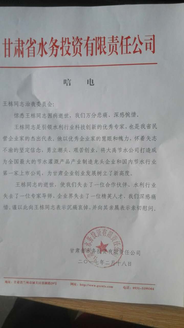 甘肃省水务投资有限责任公司唁电