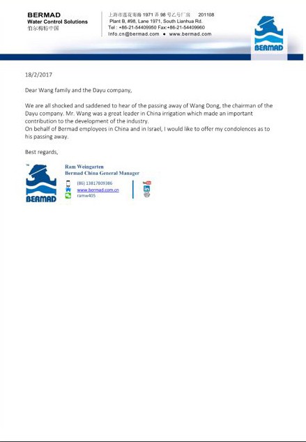 伯尔梅特中国公司总司理Ram发来的唁电