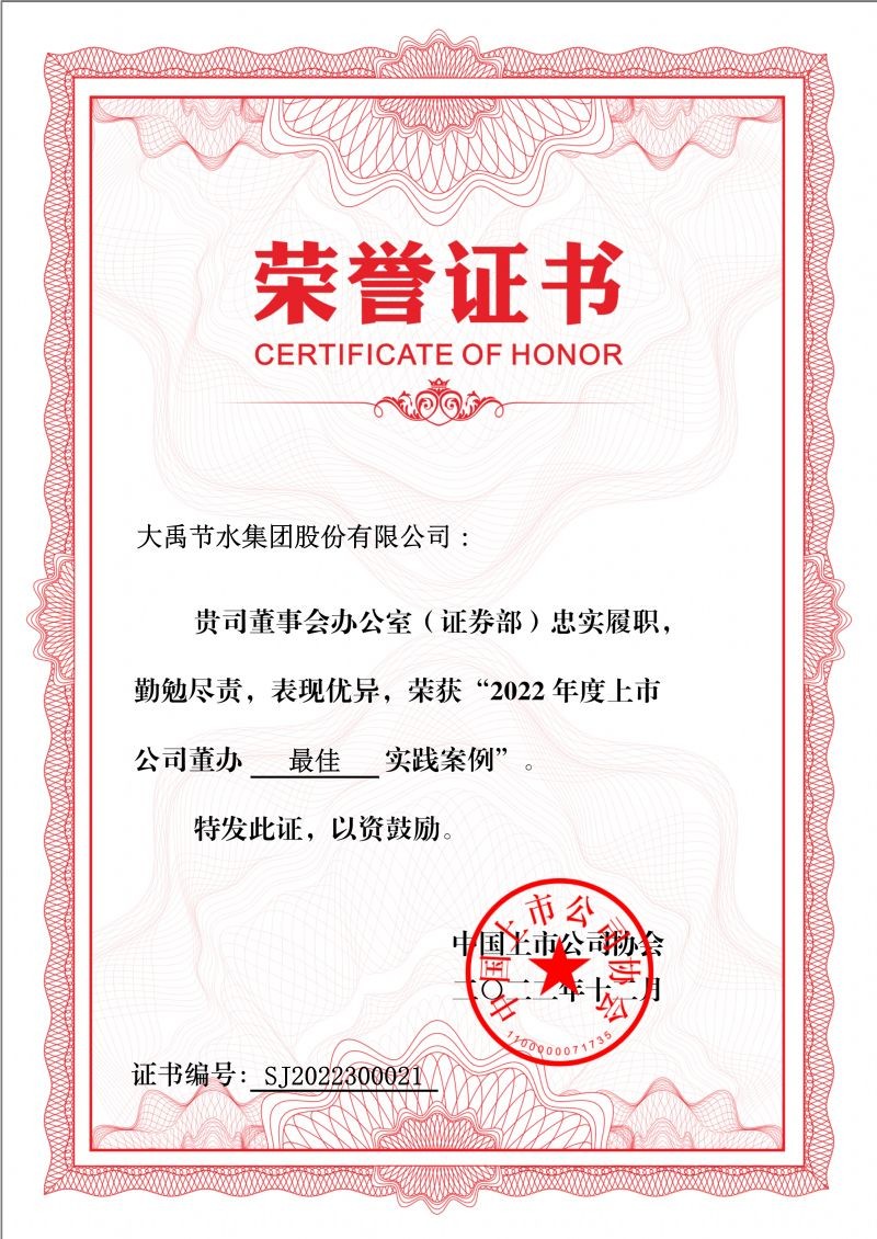 2022年12月16日,,,,,,,,中国上市公司协会宣布“2022上市公司董办最佳实践榜单“,,,,,,,,公司荣获”2022上市公司董办最佳实践奖“。 。 。。。。本次评选运动是中国上市公司协会对上市公司董事会办公室履职情形举行评价。 。 。。。。[本次评价运动获得了上市公司的起劲响应和社会各界的普遍关注,,,,,,,,共计150家上市公司入选”董办最佳实践奖“,,,,,,,,271家上市公司入选”董办优异实践奖“。 。 。。。。云顶国际vip.888节水集团公司是创业板荣获”董办最佳实践奖“的9家上市公司之一,,,,,,,,也是甘肃辖区唯逐一家荣获该奖项的的上市公司。 。 。。。。