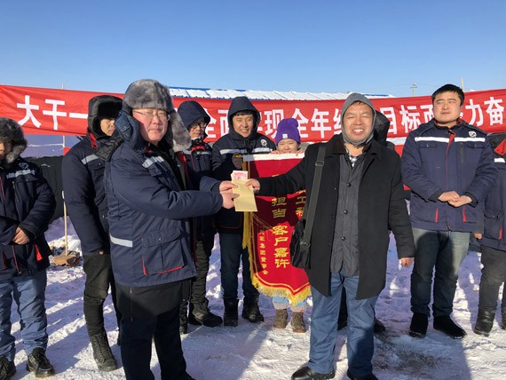 王光敏代表集团董事会现场宣读了董事长致牙克石项目一线员工的亲笔慰问信,,,,,,代表云顶国际vip.888节水董事会授予呼伦贝尔牙克石项目部“优质工程,,,,,,云顶国际vip.888精神;;;;;;责任继续,,,,,,客户嘉许”锦旗一面,,,,,,并送去了5000元慰问金及慰问品。。。。。