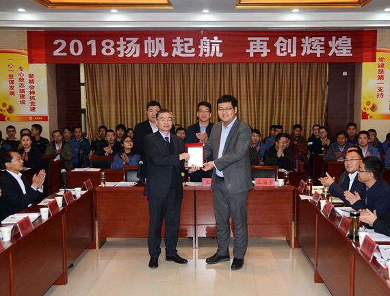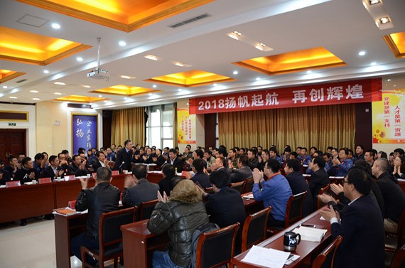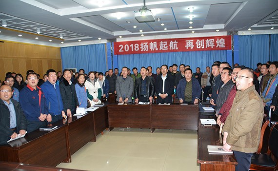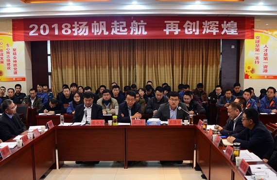大会的主题是:2018扬帆起航  再创绚烂 ,,,,,,,集团公司总裁谢永生主持大会。。。。。。