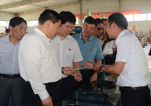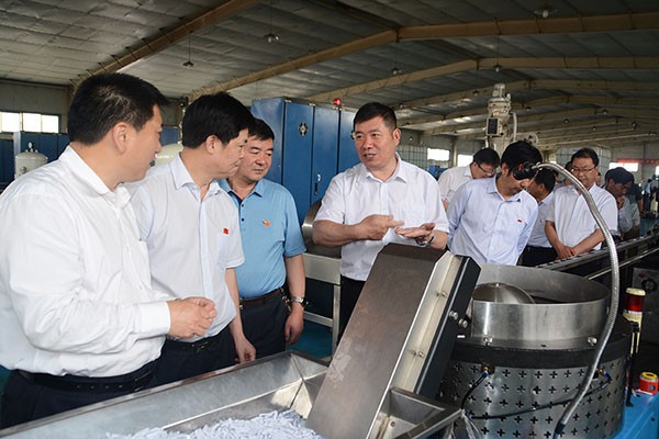 ▲集团公司总裁谢永生向调研组一行先容公司滴灌管(带)产品生产工艺