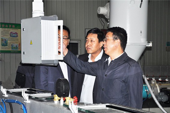 云顶国际vip.888节水集团公司党委书记、副董事长王冲等公司向导陪同李大辉总司理一行在滴灌(管)带生产车间旅行考察