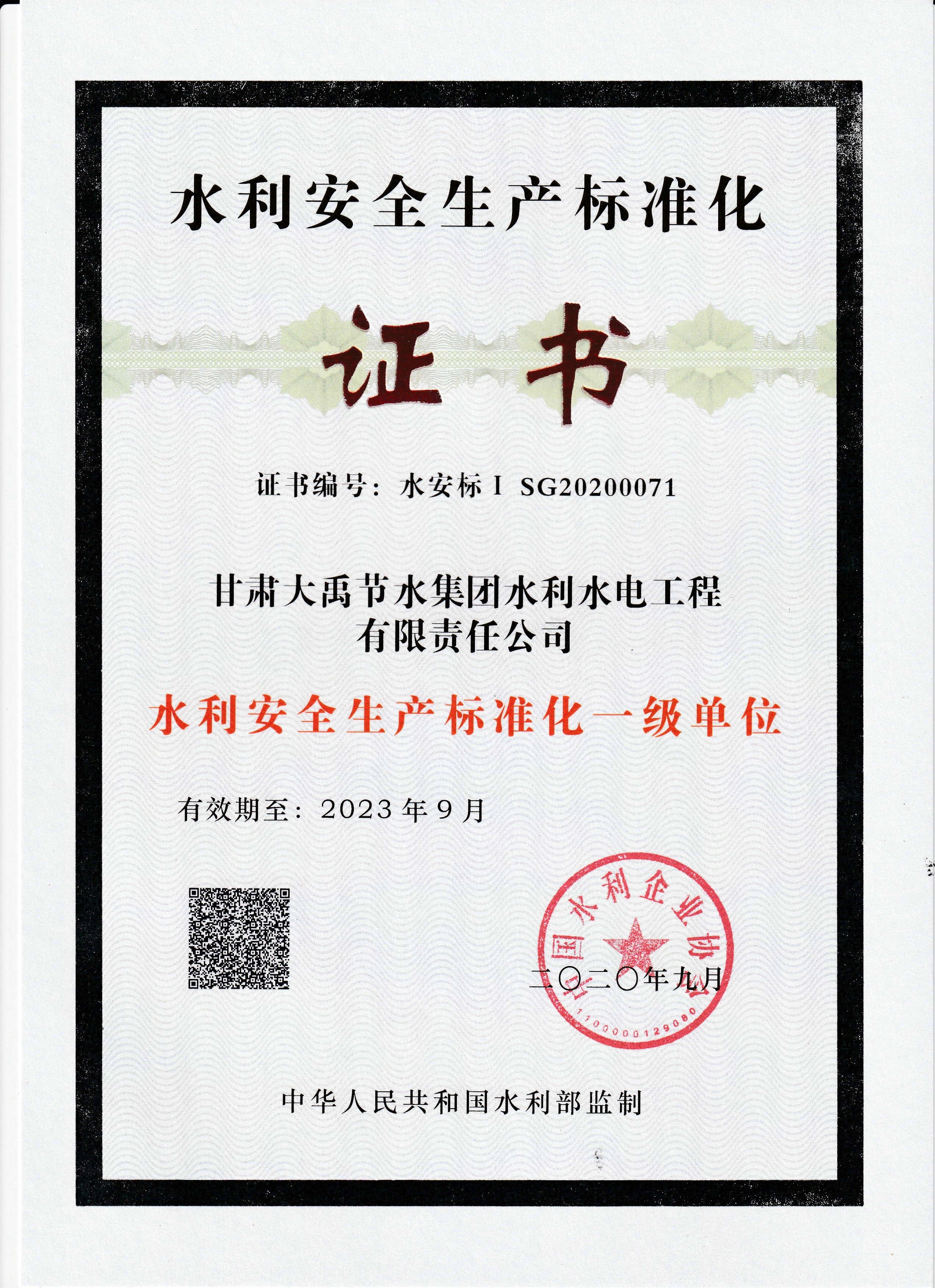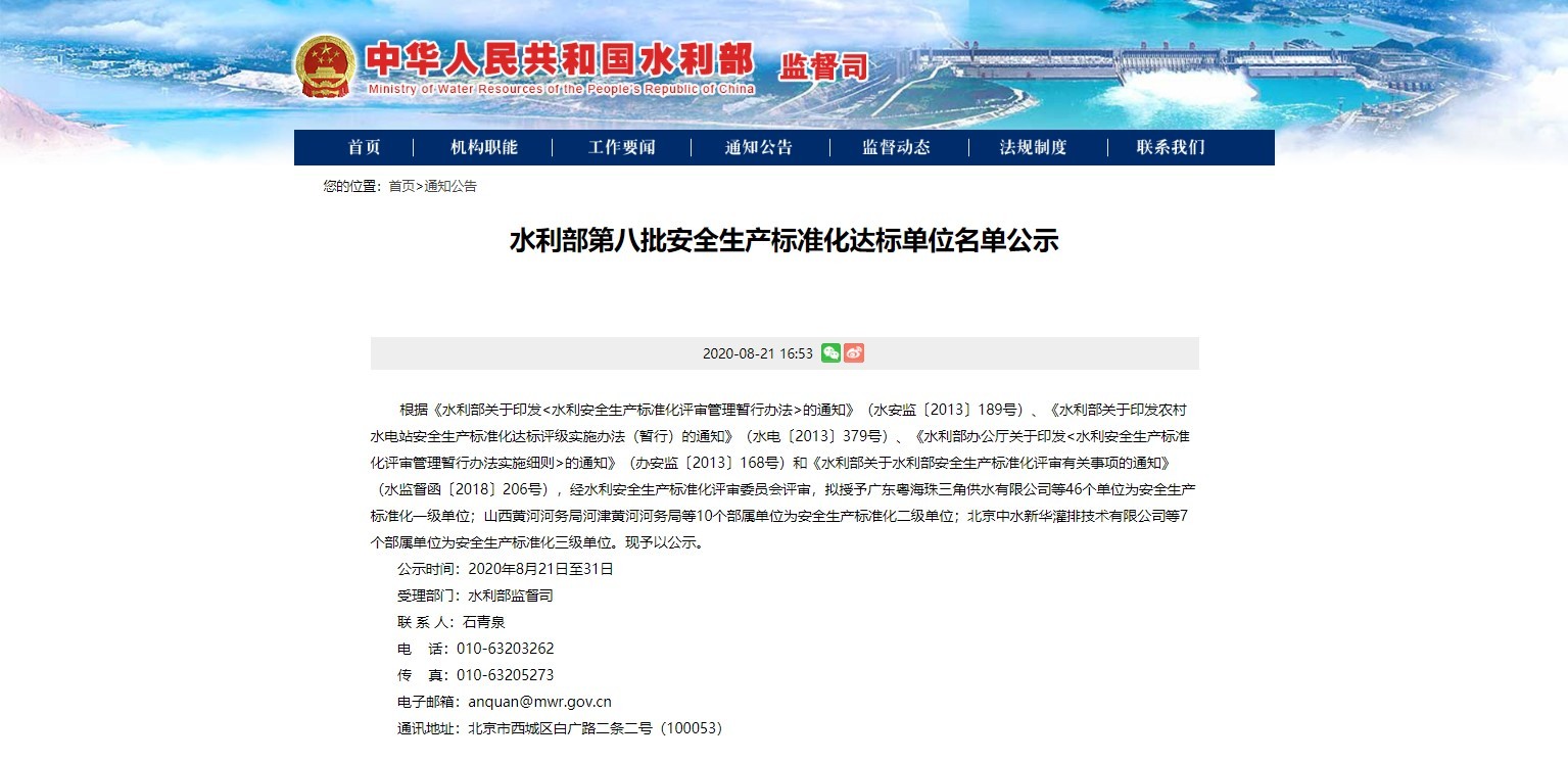 2020年08月21日,,,,,,,国家水利部官网宣布了第八批清静生产标准化达标单位公示名单,,,,,,,云顶国际vip.888节水集团水利水电工程有限责任公司被授予“水利清静生产标准化一级单位”称呼,,,,,,,是水利施工行业清静生产标准化最高品级。。。。。