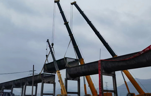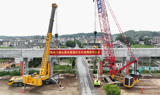 渡槽吊装中由于渡槽跨长达24米,,,,,,,吊索具约5吨,,,,,,,总吊装重量约310吨,,,,,,,最大高度13.1米,,,,,,,长度、重量和高度均超通例。。。。。。。吊装按每一跨分节吊装,,,,,,,凭证吊车吊装参数团结本工程施工条件及施工特点,,,,,,,渡槽槽身吊装以每节槽身为吊装单位举行施工,,,,,,,吊装思量接纳1台350吨履带吊+1台750吨汽车吊抬吊方法吊装。。。。。。。