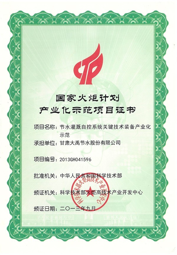 国家火炬妄想工业化树模项目证书